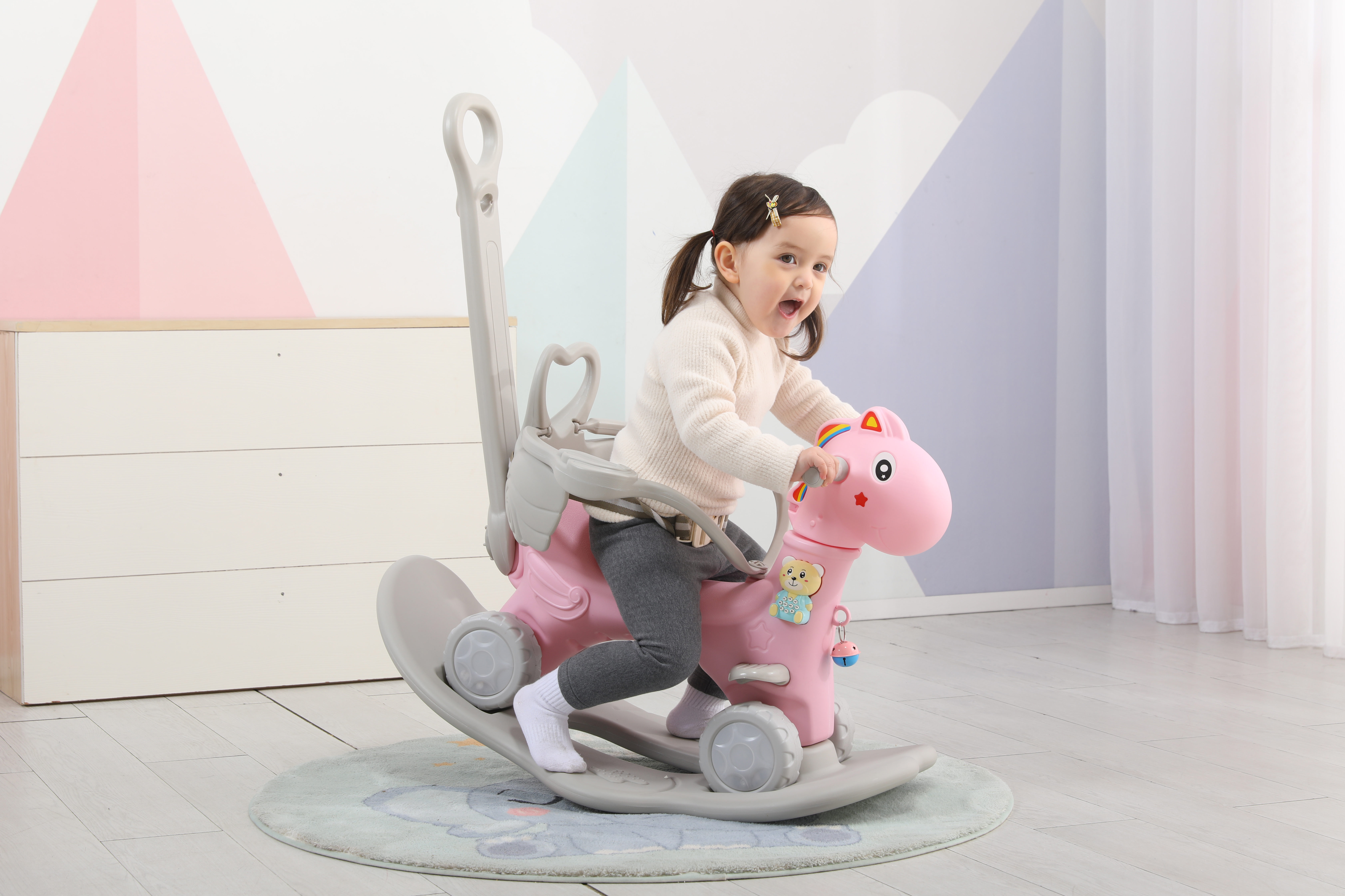 3.寓教于樂(lè):兒童搖馬不僅是一種娛樂(lè)設(shè)施,更應(yīng)該注重培養(yǎng)兒童的興趣和愛好。在設(shè)計(jì)上,可以加入一些小游戲或音樂(lè)等元素,讓孩子在搖搖晃晃中不斷探索和學(xué)習(xí)。例如:添加數(shù)字、字母等教育元素,讓孩子在玩樂(lè)中學(xué)習(xí);或者添加音樂(lè)、照明等元素,讓孩子感受到不同的樂(lè)趣。